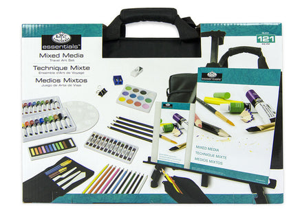 Includes deluxe carry case, easel, easel bag, acrylic paints, watercolor paints, pastels, palette and more.
